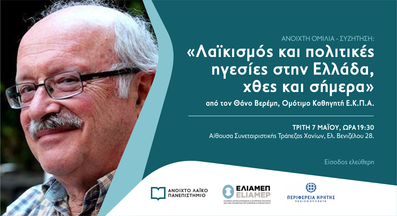 Ομιλία/συζήτηση, ανοιχτή στο κοινό των Χανίων, με θέμα: «Λαϊκισμός και πολιτικές ηγεσίες στην Ελλάδα, χθες και σήμερα», θα δώσει ο Θάνος Βερέμης, Ομότιμος Καθηγητής Εθνικού Καποδιστριακού Πανεπιστημίου Αθηνών, την Τρίτη 7 Μαϊου ώρα 19:30 στην αίθουσα της Συνεταιριστικής Τράπεζας Χανίων.
